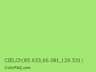 CIELCh 85.633,66.081,129.531 Color is a light green color and the nearest color is Inchworm #b2ec5d. Hex code #a3e971 and RGB value is rgb(163,233,113). In RGB color space, this color is composed of 64% red, 91% green, 44% blue, In CMYK color space, this color is composed of 30% cyan, 0% magenta, 52% yellow , 9% black , In HSL color space, this color has a hue angle of 95° , 73% saturation and 68% lightness.