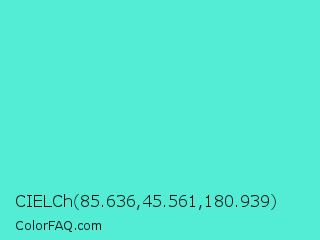 CIELCh 85.636,45.561,180.939 Color is a light cyan color and the nearest color is Turquoise #40e0d0. Hex code #53edd6 and RGB value is rgb(83,237,214). In RGB color space, this color is composed of 33% red, 93% green, 84% blue, In CMYK color space, this color is composed of 65% cyan, 0% magenta, 10% yellow , 7% black , In HSL color space, this color has a hue angle of 171° , 81% saturation and 63% lightness.