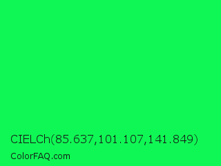 CIELCh 85.637,101.107,141.849 Color is a normal green color and the nearest color is Malachite #0bda51. Hex code #0ff754 and RGB value is rgb(15,247,84). In RGB color space, this color is composed of 6% red, 97% green, 33% blue, In CMYK color space, this color is composed of 94% cyan, 0% magenta, 66% yellow , 3% black , In HSL color space, this color has a hue angle of 138° , 94% saturation and 51% lightness.