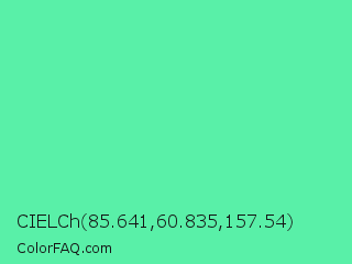 CIELCh 85.641,60.835,157.54 Color is a light green color and the nearest color is Medium Aquamarine #66ddaa. Hex code #59f0a8 and RGB value is rgb(89,240,168). In RGB color space, this color is composed of 35% red, 94% green, 66% blue, In CMYK color space, this color is composed of 63% cyan, 0% magenta, 30% yellow , 6% black , In HSL color space, this color has a hue angle of 151° , 83% saturation and 65% lightness.