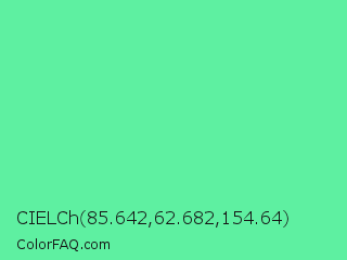 CIELCh 85.642,62.682,154.64 Color is a light green color and the nearest color is Medium Aquamarine #66ddaa. Hex code #5ef0a1 and RGB value is rgb(94,240,161). In RGB color space, this color is composed of 37% red, 94% green, 63% blue, In CMYK color space, this color is composed of 61% cyan, 0% magenta, 33% yellow , 6% black , In HSL color space, this color has a hue angle of 148° , 83% saturation and 65% lightness.