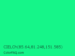CIELCh 85.64,81.248,151.585 Color is a normal green color and the nearest color is Spring Green #00ff7f. Hex code #15f589 and RGB value is rgb(21,245,137). In RGB color space, this color is composed of 8% red, 96% green, 54% blue, In CMYK color space, this color is composed of 91% cyan, 0% magenta, 44% yellow , 4% black , In HSL color space, this color has a hue angle of 151° , 92% saturation and 52% lightness.