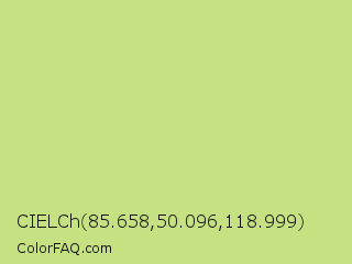 CIELCh 85.658,50.096,118.999 Color is a light lime color and the nearest color is Yellow Green #c5e17a. Hex code #c5e181 and RGB value is rgb(197,225,129). In RGB color space, this color is composed of 77% red, 88% green, 51% blue, In CMYK color space, this color is composed of 12% cyan, 0% magenta, 43% yellow , 12% black , In HSL color space, this color has a hue angle of 78° , 62% saturation and 69% lightness.