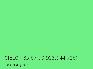 CIELCh 85.67,70.953,144.726 Color is a light green color and the nearest color is Very Light Malachite Green #64e986. Hex code #6ef085 and RGB value is rgb(110,240,133). In RGB color space, this color is composed of 43% red, 94% green, 52% blue, In CMYK color space, this color is composed of 54% cyan, 0% magenta, 45% yellow , 6% black , In HSL color space, this color has a hue angle of 131° , 81% saturation and 69% lightness.