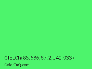 CIELCh 85.686,87.2,142.933 Color is a light green color and the nearest color is Screamin Green #66ff66. Hex code #4df46c and RGB value is rgb(77,244,108). In RGB color space, this color is composed of 30% red, 96% green, 42% blue, In CMYK color space, this color is composed of 68% cyan, 0% magenta, 56% yellow , 4% black , In HSL color space, this color has a hue angle of 131° , 88% saturation and 63% lightness.