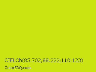 CIELCh 85.702,88.222,110.123 Color is a normal yellow color and the nearest color is Las Palmas #c6e610. Hex code #c9e310 and RGB value is rgb(201,227,16). In RGB color space, this color is composed of 79% red, 89% green, 6% blue, In CMYK color space, this color is composed of 11% cyan, 0% magenta, 93% yellow , 11% black , In HSL color space, this color has a hue angle of 67° , 87% saturation and 48% lightness.