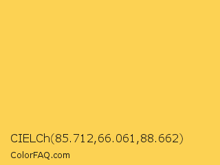 CIELCh 85.712,66.061,88.662 Color is a light orange color and the nearest color is Mustard #ffdb58. Hex code #fcd253 and RGB value is rgb(252,210,83). In RGB color space, this color is composed of 99% red, 82% green, 33% blue, In CMYK color space, this color is composed of 0% cyan, 17% magenta, 67% yellow , 1% black , In HSL color space, this color has a hue angle of 45° , 97% saturation and 66% lightness.