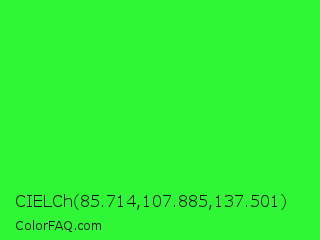 CIELCh 85.714,107.885,137.501 Color is a normal green color and the nearest color is Neon Green #39ff14. Hex code #30f736 and RGB value is rgb(48,247,54). In RGB color space, this color is composed of 19% red, 97% green, 21% blue, In CMYK color space, this color is composed of 81% cyan, 0% magenta, 78% yellow , 3% black , In HSL color space, this color has a hue angle of 122° , 93% saturation and 58% lightness.