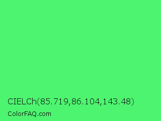 CIELCh 85.719,86.104,143.48 Color is a light green color and the nearest color is Screamin Green #66ff66. Hex code #4df46f and RGB value is rgb(77,244,111). In RGB color space, this color is composed of 30% red, 96% green, 44% blue, In CMYK color space, this color is composed of 68% cyan, 0% magenta, 55% yellow , 4% black , In HSL color space, this color has a hue angle of 132° , 88% saturation and 63% lightness.