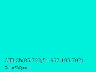 CIELCh 85.723,51.937,183.702 Color is a normal cyan color and the nearest color is Bright Turquoise #08e8de. Hex code #00f0db and RGB value is rgb(0,240,219). In RGB color space, this color is composed of 0% red, 94% green, 86% blue, In CMYK color space, this color is composed of 100% cyan, 0% magenta, 9% yellow , 6% black , In HSL color space, this color has a hue angle of 175° , 100% saturation and 47% lightness.