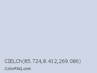 CIELCh 85.724,8.412,269.086 Color is a very light blue color and the nearest color is Botticelli #c7dde5. Hex code #ced7e6 and RGB value is rgb(206,215,230). In RGB color space, this color is composed of 81% red, 84% green, 90% blue, In CMYK color space, this color is composed of 10% cyan, 7% magenta, 0% yellow , 10% black , In HSL color space, this color has a hue angle of 218° , 32% saturation and 85% lightness.