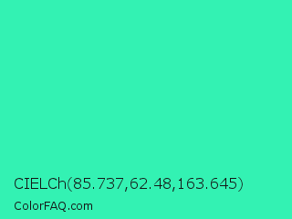 CIELCh 85.737,62.48,163.645 Color is a normal green color and the nearest color is Eucalyptus #44d7a8. Hex code #33f2b3 and RGB value is rgb(51,242,179). In RGB color space, this color is composed of 20% red, 95% green, 70% blue, In CMYK color space, this color is composed of 79% cyan, 0% magenta, 26% yellow , 5% black , In HSL color space, this color has a hue angle of 160° , 88% saturation and 57% lightness.
