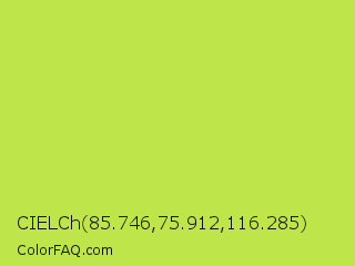 CIELCh 85.746,75.912,116.285 Color is a normal lime color and the nearest color is June Bud #bdda57. Hex code #bee54a and RGB value is rgb(190,229,74). In RGB color space, this color is composed of 75% red, 90% green, 29% blue, In CMYK color space, this color is composed of 17% cyan, 0% magenta, 68% yellow , 10% black , In HSL color space, this color has a hue angle of 75° , 75% saturation and 59% lightness.