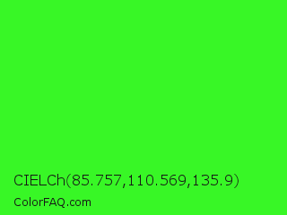 CIELCh 85.757,110.569,135.9 Color is a normal green color and the nearest color is Neon Green #39ff14. Hex code #38f726 and RGB value is rgb(56,247,38). In RGB color space, this color is composed of 22% red, 97% green, 15% blue, In CMYK color space, this color is composed of 77% cyan, 0% magenta, 85% yellow , 3% black , In HSL color space, this color has a hue angle of 115° , 93% saturation and 56% lightness.