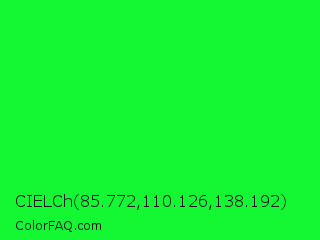 CIELCh 85.772,110.126,138.192 Color is a normal green color and the nearest color is Malachite #0bda51. Hex code #14f834 and RGB value is rgb(20,248,52). In RGB color space, this color is composed of 8% red, 97% green, 20% blue, In CMYK color space, this color is composed of 92% cyan, 0% magenta, 79% yellow , 3% black , In HSL color space, this color has a hue angle of 128° , 94% saturation and 53% lightness.
