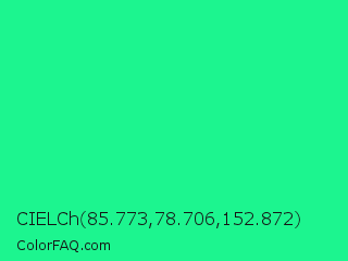 CIELCh 85.773,78.706,152.872 Color is a normal green color and the nearest color is Medium Spring Green #00fa9a. Hex code #1cf58f and RGB value is rgb(28,245,143). In RGB color space, this color is composed of 11% red, 96% green, 56% blue, In CMYK color space, this color is composed of 89% cyan, 0% magenta, 42% yellow , 4% black , In HSL color space, this color has a hue angle of 152° , 92% saturation and 54% lightness.