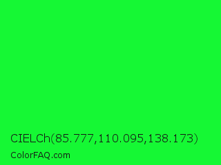 CIELCh 85.777,110.095,138.173 Color is a normal green color and the nearest color is Malachite #0bda51. Hex code #15f834 and RGB value is rgb(21,248,52). In RGB color space, this color is composed of 8% red, 97% green, 20% blue, In CMYK color space, this color is composed of 92% cyan, 0% magenta, 79% yellow , 3% black , In HSL color space, this color has a hue angle of 128° , 94% saturation and 53% lightness.
