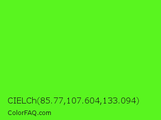 CIELCh 85.77,107.604,133.094 Color is a normal green color and the nearest color is Bright Green #66ff00. Hex code #59f51f and RGB value is rgb(89,245,31). In RGB color space, this color is composed of 35% red, 96% green, 12% blue, In CMYK color space, this color is composed of 64% cyan, 0% magenta, 87% yellow , 4% black , In HSL color space, this color has a hue angle of 104° , 91% saturation and 54% lightness.