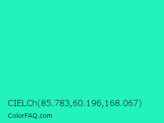 CIELCh 85.783,60.196,168.067 Color is a normal cyan color and the nearest color is Turquoise PWG #30d5c8. Hex code #24f2bd and RGB value is rgb(36,242,189). In RGB color space, this color is composed of 14% red, 95% green, 74% blue, In CMYK color space, this color is composed of 85% cyan, 0% magenta, 22% yellow , 5% black , In HSL color space, this color has a hue angle of 165° , 89% saturation and 55% lightness.