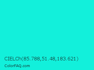 CIELCh 85.788,51.48,183.621 Color is a normal cyan color and the nearest color is Bright Turquoise #08e8de. Hex code #12f0db and RGB value is rgb(18,240,219). In RGB color space, this color is composed of 7% red, 94% green, 86% blue, In CMYK color space, this color is composed of 93% cyan, 0% magenta, 9% yellow , 6% black , In HSL color space, this color has a hue angle of 174° , 88% saturation and 51% lightness.