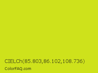 CIELCh 85.803,86.102,108.736 Color is a normal yellow color and the nearest color is Las Palmas #c6e610. Hex code #cee21b and RGB value is rgb(206,226,27). In RGB color space, this color is composed of 81% red, 89% green, 11% blue, In CMYK color space, this color is composed of 9% cyan, 0% magenta, 88% yellow , 11% black , In HSL color space, this color has a hue angle of 66° , 79% saturation and 50% lightness.