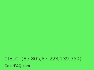 CIELCh 85.805,87.223,139.369 Color is a light green color and the nearest color is Screamin Green #66ff66. Hex code #62f363 and RGB value is rgb(98,243,99). In RGB color space, this color is composed of 38% red, 95% green, 39% blue, In CMYK color space, this color is composed of 60% cyan, 0% magenta, 59% yellow , 5% black , In HSL color space, this color has a hue angle of 120° , 86% saturation and 67% lightness.