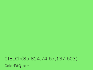 CIELCh 85.814,74.67,137.603 Color is a light green color and the nearest color is Pastel Green #77dd77. Hex code #81ef72 and RGB value is rgb(129,239,114). In RGB color space, this color is composed of 51% red, 94% green, 45% blue, In CMYK color space, this color is composed of 46% cyan, 0% magenta, 52% yellow , 6% black , In HSL color space, this color has a hue angle of 113° , 80% saturation and 69% lightness.