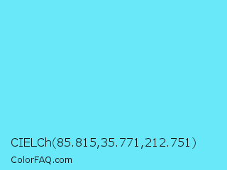 CIELCh 85.815,35.771,212.751 Color is a light cyan color and the nearest color is Spray #79deec. Hex code #69e8fa and RGB value is rgb(105,232,250). In RGB color space, this color is composed of 41% red, 91% green, 98% blue, In CMYK color space, this color is composed of 58% cyan, 7% magenta, 0% yellow , 2% black , In HSL color space, this color has a hue angle of 187° , 94% saturation and 70% lightness.