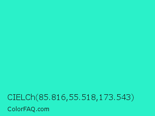 CIELCh 85.816,55.518,173.543 Color is a normal cyan color and the nearest color is Turquoise PWG #30d5c8. Hex code #2af1c9 and RGB value is rgb(42,241,201). In RGB color space, this color is composed of 16% red, 95% green, 79% blue, In CMYK color space, this color is composed of 83% cyan, 0% magenta, 17% yellow , 5% black , In HSL color space, this color has a hue angle of 168° , 88% saturation and 55% lightness.