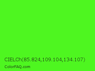 CIELCh 85.824,109.104,134.107 Color is a normal green color and the nearest color is Neon Green #39ff14. Hex code #4ef620 and RGB value is rgb(78,246,32). In RGB color space, this color is composed of 31% red, 96% green, 13% blue, In CMYK color space, this color is composed of 68% cyan, 0% magenta, 87% yellow , 4% black , In HSL color space, this color has a hue angle of 107° , 92% saturation and 55% lightness.