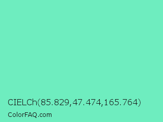 CIELCh 85.829,47.474,165.764 Color is a light green color and the nearest color is Bermuda #7dd8c6. Hex code #6eedbf and RGB value is rgb(110,237,191). In RGB color space, this color is composed of 43% red, 93% green, 75% blue, In CMYK color space, this color is composed of 54% cyan, 0% magenta, 19% yellow , 7% black , In HSL color space, this color has a hue angle of 158° , 78% saturation and 68% lightness.