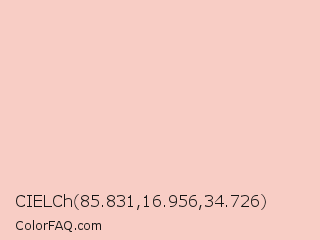 CIELCh 85.831,16.956,34.726 Color is a very light red color and the nearest color is Baby Pink #f4c2c2. Hex code #f8cdc5 and RGB value is rgb(248,205,197). In RGB color space, this color is composed of 97% red, 80% green, 77% blue, In CMYK color space, this color is composed of 0% cyan, 17% magenta, 21% yellow , 3% black , In HSL color space, this color has a hue angle of 9° , 78% saturation and 87% lightness.