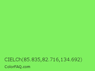 CIELCh 85.835,82.716,134.692 Color is a light green color and the nearest color is Screamin Green #66ff66. Hex code #7ff05f and RGB value is rgb(127,240,95). In RGB color space, this color is composed of 50% red, 94% green, 37% blue, In CMYK color space, this color is composed of 47% cyan, 0% magenta, 60% yellow , 6% black , In HSL color space, this color has a hue angle of 107° , 83% saturation and 66% lightness.
