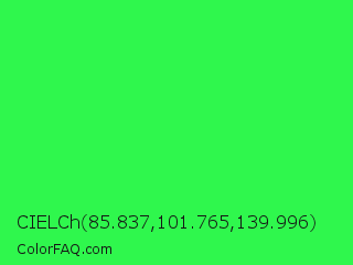 CIELCh 85.837,101.765,139.996 Color is a normal green color and the nearest color is Malachite #0bda51. Hex code #2ff74d and RGB value is rgb(47,247,77). In RGB color space, this color is composed of 18% red, 97% green, 30% blue, In CMYK color space, this color is composed of 81% cyan, 0% magenta, 69% yellow , 3% black , In HSL color space, this color has a hue angle of 129° , 93% saturation and 58% lightness.