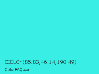 CIELCh 85.83,46.14,190.49 Color is a normal cyan color and the nearest color is Turquoise #40e0d0. Hex code #38eee5 and RGB value is rgb(56,238,229). In RGB color space, this color is composed of 22% red, 93% green, 90% blue, In CMYK color space, this color is composed of 76% cyan, 0% magenta, 4% yellow , 7% black , In HSL color space, this color has a hue angle of 177° , 84% saturation and 58% lightness.