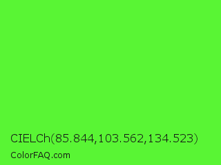 CIELCh 85.844,103.562,134.523 Color is a normal green color and the nearest color is Neon Green #39ff14. Hex code #59f534 and RGB value is rgb(89,245,52). In RGB color space, this color is composed of 35% red, 96% green, 20% blue, In CMYK color space, this color is composed of 64% cyan, 0% magenta, 79% yellow , 4% black , In HSL color space, this color has a hue angle of 108° , 91% saturation and 58% lightness.