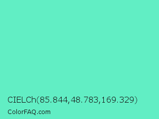 CIELCh 85.844,48.783,169.329 Color is a light green color and the nearest color is Medium Aquamarine #66ddaa. Hex code #61eec4 and RGB value is rgb(97,238,196). In RGB color space, this color is composed of 38% red, 93% green, 77% blue, In CMYK color space, this color is composed of 59% cyan, 0% magenta, 18% yellow , 7% black , In HSL color space, this color has a hue angle of 162° , 81% saturation and 66% lightness.