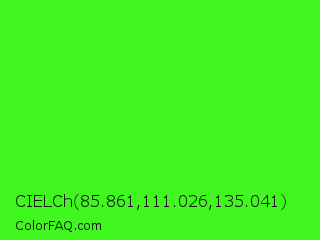 CIELCh 85.861,111.026,135.041 Color is a normal green color and the nearest color is Neon Green #39ff14. Hex code #40f71f and RGB value is rgb(64,247,31). In RGB color space, this color is composed of 25% red, 97% green, 12% blue, In CMYK color space, this color is composed of 74% cyan, 0% magenta, 87% yellow , 3% black , In HSL color space, this color has a hue angle of 111° , 93% saturation and 55% lightness.