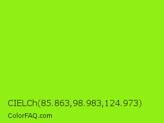CIELCh 85.863,98.983,124.973 Color is a normal green color and the nearest color is Alien Armpit #84de02. Hex code #90ef14 and RGB value is rgb(144,239,20). In RGB color space, this color is composed of 56% red, 94% green, 8% blue, In CMYK color space, this color is composed of 40% cyan, 0% magenta, 92% yellow , 6% black , In HSL color space, this color has a hue angle of 86° , 87% saturation and 51% lightness.