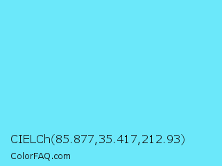 CIELCh 85.877,35.417,212.93 Color is a light cyan color and the nearest color is Spray #79deec. Hex code #6be8fa and RGB value is rgb(107,232,250). In RGB color space, this color is composed of 42% red, 91% green, 98% blue, In CMYK color space, this color is composed of 57% cyan, 7% magenta, 0% yellow , 2% black , In HSL color space, this color has a hue angle of 188° , 93% saturation and 70% lightness.
