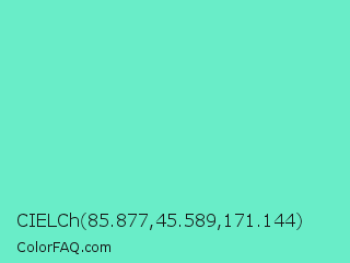 CIELCh 85.877,45.589,171.144 Color is a light green color and the nearest color is Bermuda #7dd8c6. Hex code #69edc8 and RGB value is rgb(105,237,200). In RGB color space, this color is composed of 41% red, 93% green, 78% blue, In CMYK color space, this color is composed of 56% cyan, 0% magenta, 16% yellow , 7% black , In HSL color space, this color has a hue angle of 163° , 79% saturation and 67% lightness.