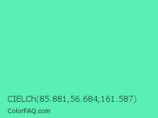 CIELCh 85.881,56.684,161.587 Color is a light green color and the nearest color is Medium Aquamarine #66ddaa. Hex code #5af0b3 and RGB value is rgb(90,240,179). In RGB color space, this color is composed of 35% red, 94% green, 70% blue, In CMYK color space, this color is composed of 63% cyan, 0% magenta, 25% yellow , 6% black , In HSL color space, this color has a hue angle of 156° , 83% saturation and 65% lightness.