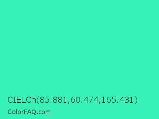 CIELCh 85.881,60.474,165.431 Color is a normal green color and the nearest color is Turquoise #40e0d0. Hex code #36f2b8 and RGB value is rgb(54,242,184). In RGB color space, this color is composed of 21% red, 95% green, 72% blue, In CMYK color space, this color is composed of 78% cyan, 0% magenta, 24% yellow , 5% black , In HSL color space, this color has a hue angle of 161° , 88% saturation and 58% lightness.
