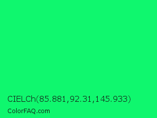 CIELCh 85.881,92.31,145.933 Color is a normal green color and the nearest color is Spring Green #00ff7f. Hex code #0ff76e and RGB value is rgb(15,247,110). In RGB color space, this color is composed of 6% red, 97% green, 43% blue, In CMYK color space, this color is composed of 94% cyan, 0% magenta, 55% yellow , 3% black , In HSL color space, this color has a hue angle of 145° , 94% saturation and 51% lightness.