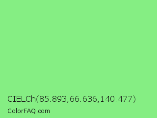 CIELCh 85.893,66.636,140.477 Color is a light green color and the nearest color is Light Green #90ee90. Hex code #85ee83 and RGB value is rgb(133,238,131). In RGB color space, this color is composed of 52% red, 93% green, 51% blue, In CMYK color space, this color is composed of 44% cyan, 0% magenta, 45% yellow , 7% black , In HSL color space, this color has a hue angle of 119° , 76% saturation and 72% lightness.