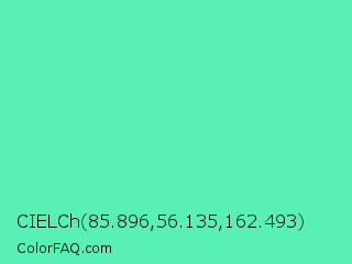 CIELCh 85.896,56.135,162.493 Color is a light green color and the nearest color is Medium Aquamarine #66ddaa. Hex code #59f0b5 and RGB value is rgb(89,240,181). In RGB color space, this color is composed of 35% red, 94% green, 71% blue, In CMYK color space, this color is composed of 63% cyan, 0% magenta, 25% yellow , 6% black , In HSL color space, this color has a hue angle of 157° , 83% saturation and 65% lightness.