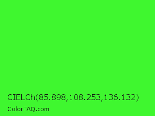 CIELCh 85.898,108.253,136.132 Color is a normal green color and the nearest color is Neon Green #39ff14. Hex code #3ff72f and RGB value is rgb(63,247,47). In RGB color space, this color is composed of 25% red, 97% green, 18% blue, In CMYK color space, this color is composed of 74% cyan, 0% magenta, 81% yellow , 3% black , In HSL color space, this color has a hue angle of 115° , 93% saturation and 58% lightness.