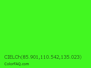 CIELCh 85.901,110.542,135.023 Color is a normal green color and the nearest color is Neon Green #39ff14. Hex code #42f721 and RGB value is rgb(66,247,33). In RGB color space, this color is composed of 26% red, 97% green, 13% blue, In CMYK color space, this color is composed of 73% cyan, 0% magenta, 87% yellow , 3% black , In HSL color space, this color has a hue angle of 111° , 93% saturation and 55% lightness.