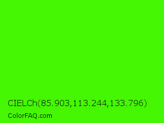 CIELCh 85.903,113.244,133.796 Color is a normal green color and the nearest color is Chlorophyll Green #4aff00. Hex code #45f703 and RGB value is rgb(69,247,3). In RGB color space, this color is composed of 27% red, 97% green, 1% blue, In CMYK color space, this color is composed of 72% cyan, 0% magenta, 99% yellow , 3% black , In HSL color space, this color has a hue angle of 104° , 98% saturation and 49% lightness.