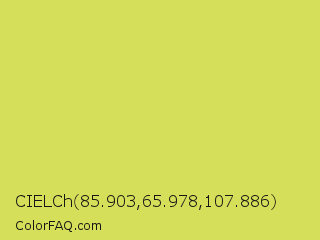 CIELCh 85.903,65.978,107.886 Color is a light yellow color and the nearest color is Maximum Green Yellow #d9e650. Hex code #d6df59 and RGB value is rgb(214,223,89). In RGB color space, this color is composed of 84% red, 87% green, 35% blue, In CMYK color space, this color is composed of 4% cyan, 0% magenta, 60% yellow , 13% black , In HSL color space, this color has a hue angle of 64° , 68% saturation and 61% lightness.